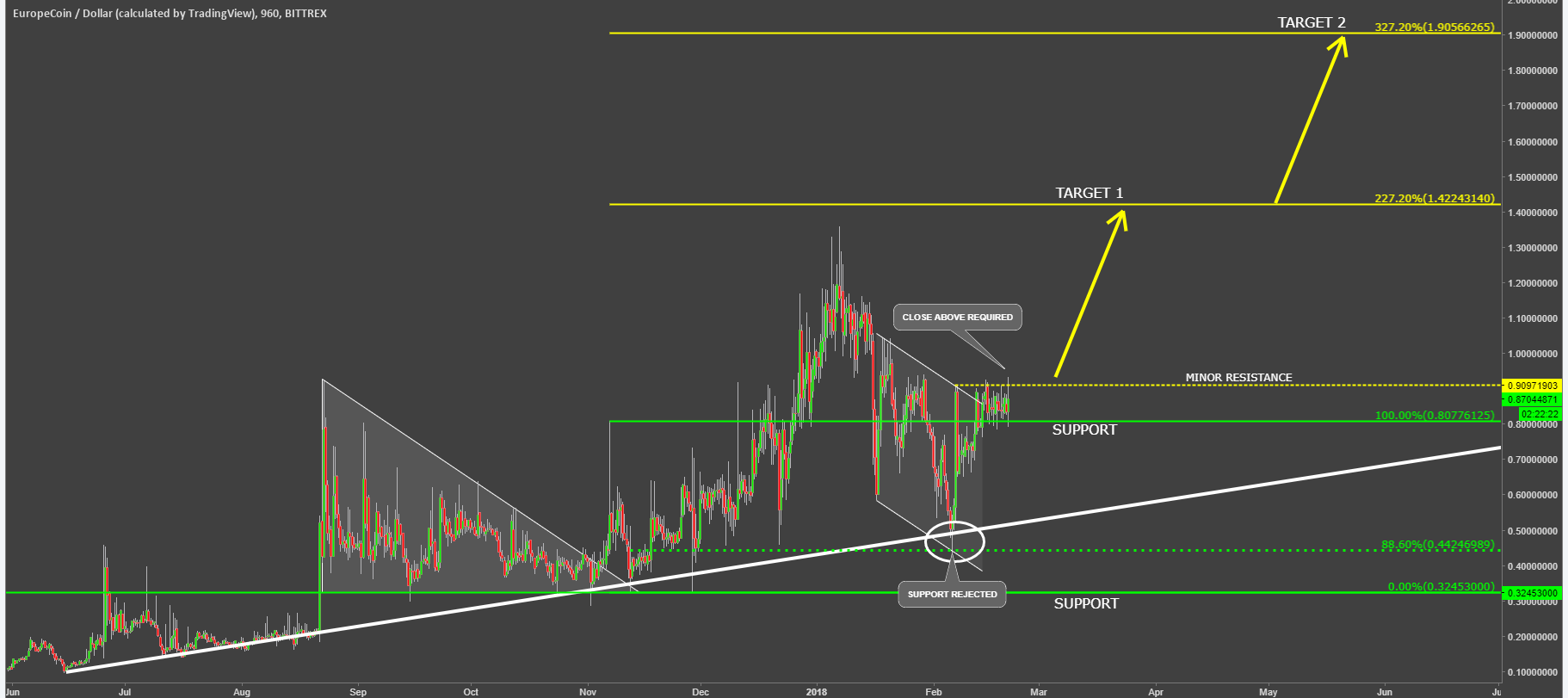 EuropeCoin clearly trending upwards as the uptrend trendline is being rejected repeatedly.